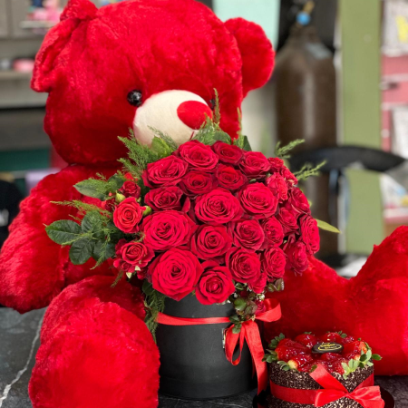 Make an unforgettable impression with the romantic gift set, the ultimate expression of love and celebration available for delivery throughout Jordan, especially in Amman. This wonderful package includes a large, soft red teddy bear, ready to embrace your loved ones. Alongside it, you’ll find a stunning black round box filled with fresh and silky red roses, carefully arranged to express deep feelings of affection and passion. This luxurious gift is complemented by a delightful chocolate cake, generously topped with fresh strawberries and rich chocolate, perfect for any sweet celebration. Whether you are looking for the perfect anniversary gift in Amman, a stunning birthday surprise, or a truly great Valentine’s gift, this collection of flowers, teddy bear, and cake is designed to create lasting memories. We guarantee fast and reliable gift delivery in Amman, ensuring your thoughtful gesture arrives in excellent condition. Elevate your gift-giving experience with this luxurious collection from a trusted source.