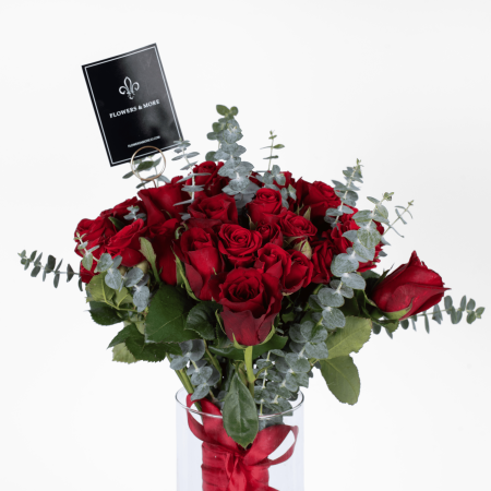 Elevate your romance with this timeless arrangement of deep red roses and fresh eucalyptus stems, elegantly displayed in a glass cylinder vase with decorative pebbles. Finished with a satin red bow, it’s a sophisticated choice for Valentine’s Day delivery anywhere in Amman.